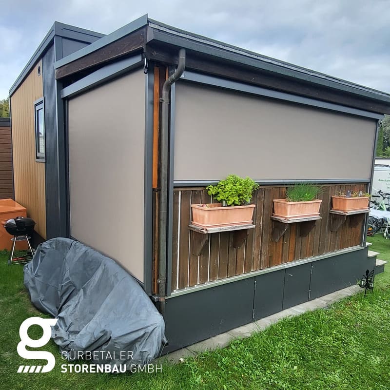 Hier durften wir unsere Senkrechtbeschattung mit technischem Gewebe bei einem Mobile-Home Vorbau montieren. Dank der Teildurchsicht bleibt das innere freundlich