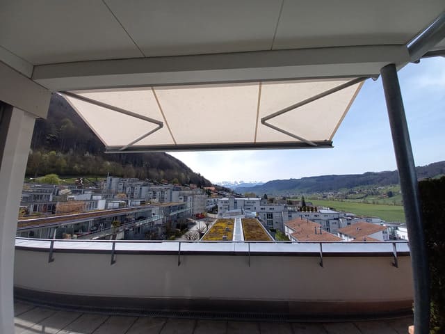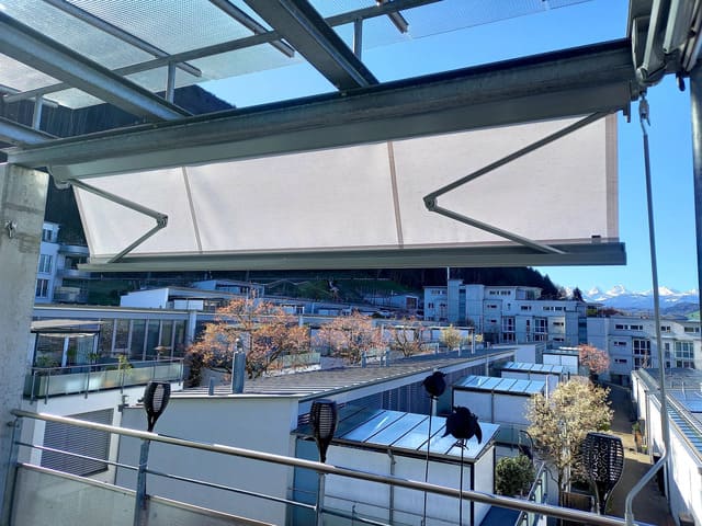 Grosse Beschattung, schlank verpackt. Hier in der Ausführung mit blickdichtem Tuch.