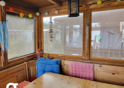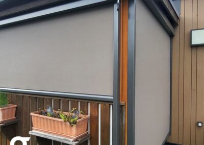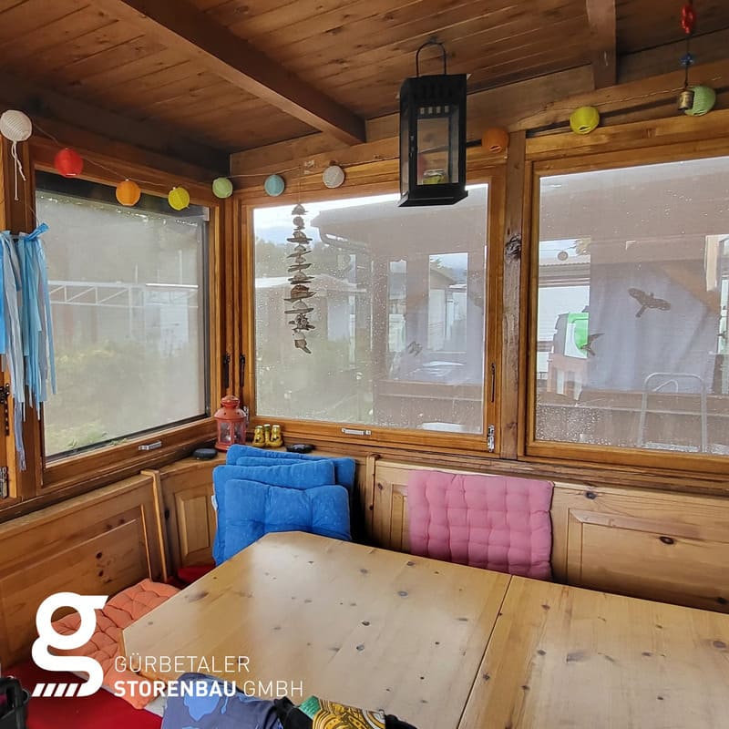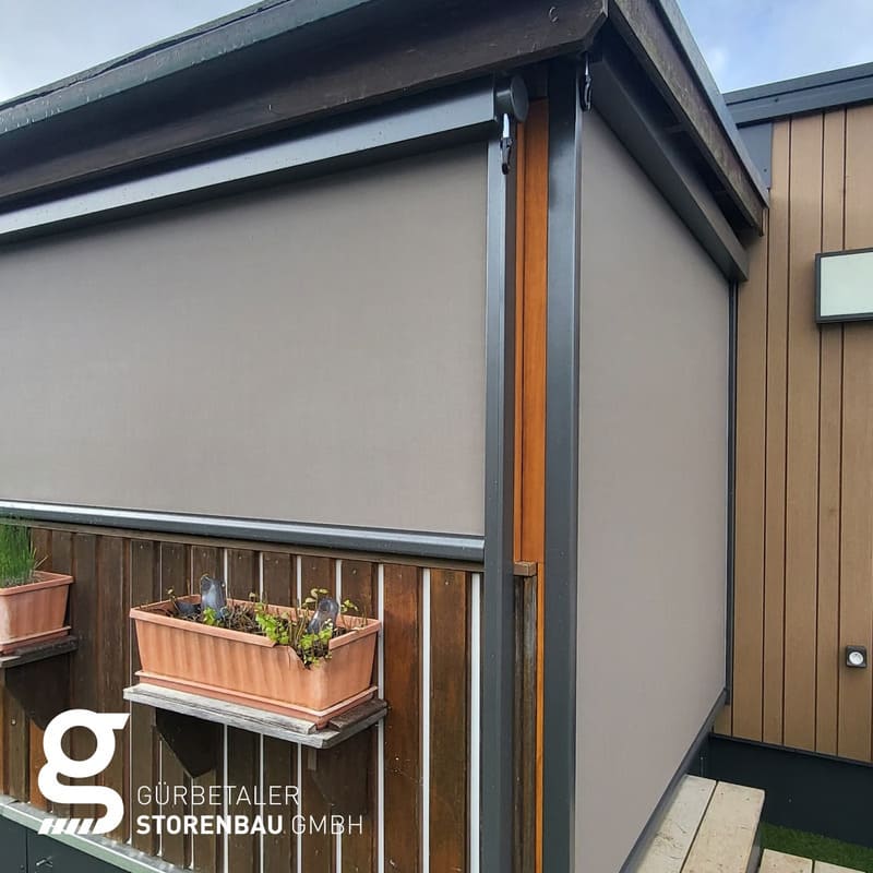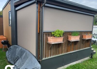 Hier durften wir unsere Senkrechtbeschattung mit technischem Gewebe bei einem Mobile-Home Vorbau montieren. Dank der Teildurchsicht bleibt das innere freundlich offen und dabei gegen innen Blickdicht.
